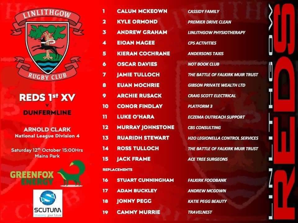 Dunfermline just about deserved the positive result as they did win the try count 7 to 3 but it was well within the range of the Reds to have won the game. As a general observation, things are going quite well with 3 wins and 3 losses to date. We have also played the top 4 teams in the Division and sit in mid table and the next few weeks will see the Reds play 3 teams who currently sit below us. Next week sees North Berwick at Mains Park for a 3pm kick off and it would be great for a large crowd to be there to cheer on the Reds.