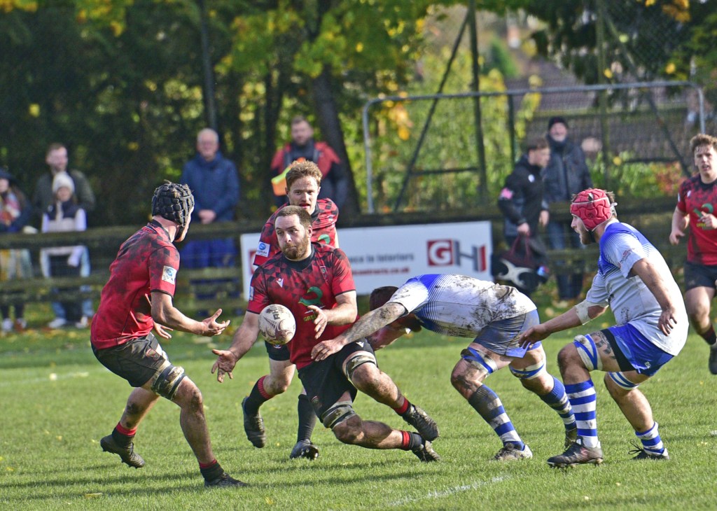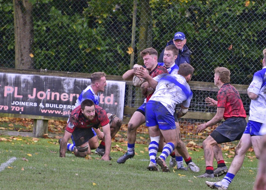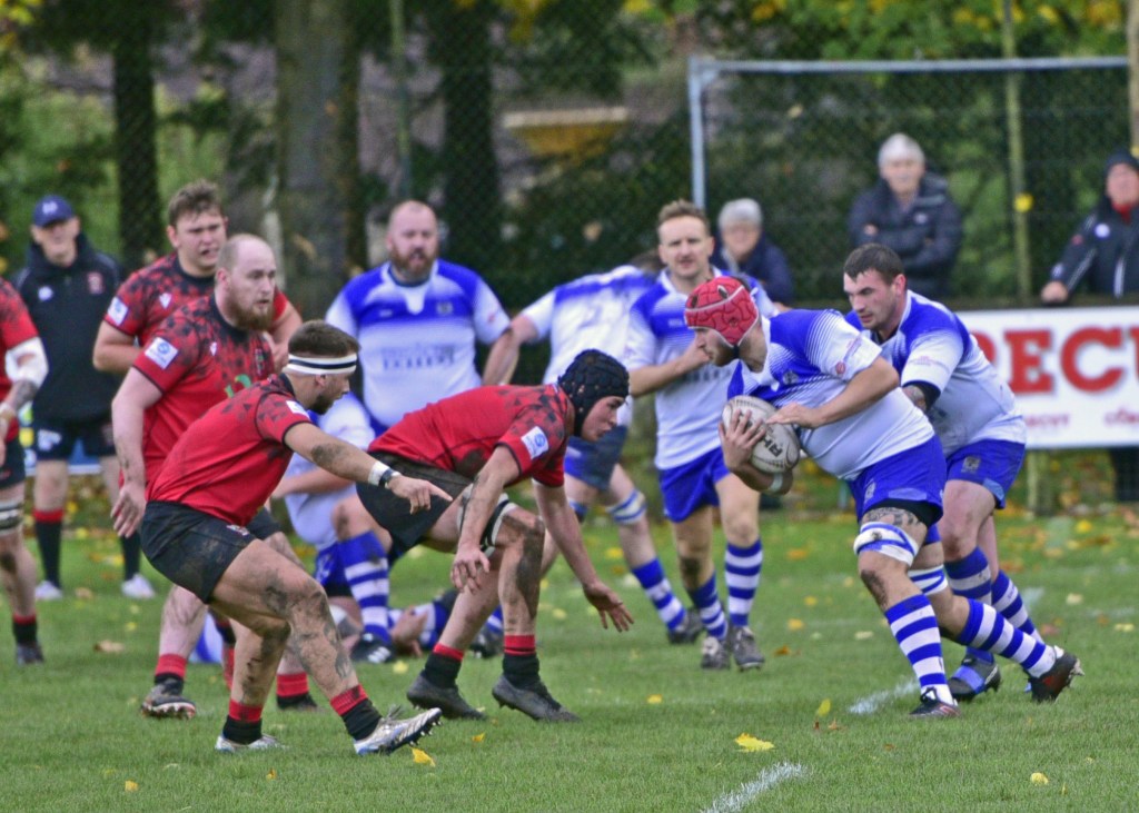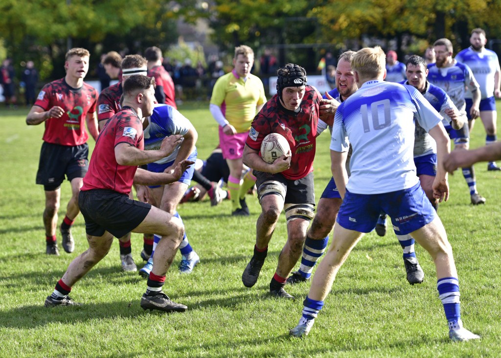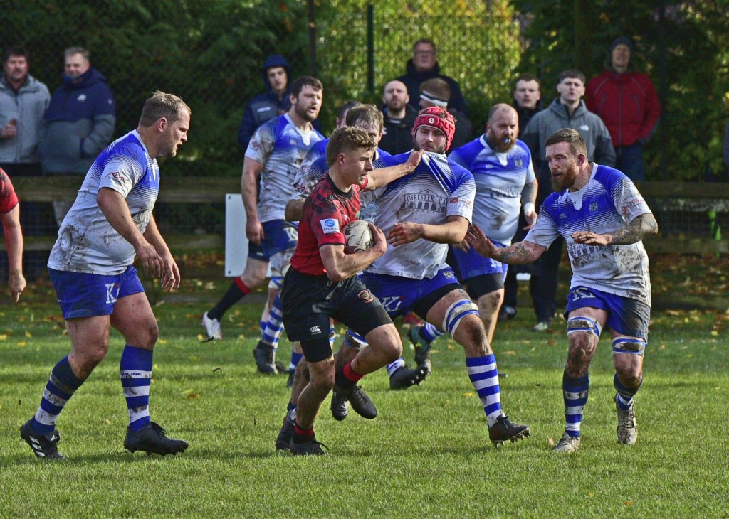 Dunfermline were playing a simple game with strong ball carrying by their forwards allied to moving the ball quickly along the backline. However, the home side repelled these attacks comfortably in the first half. The forwards were just about holding their own against a bigger pack and at the lineout Oscar Davies was prominent in taking good ball but also in disrupting the visitors’ line out.