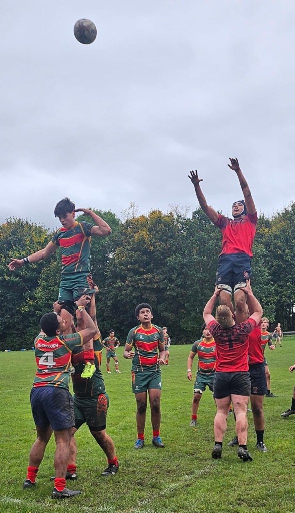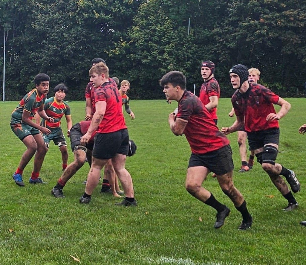 At 3pm, after a shower of rain to grease up the pitch and the ball, the Reds kicked off to Queen Victoria’s and the game was afoot. The home side were clearly determined to make a strong start and were quick off the mark in defence, making dominant tackles and forcing QVS back into their own territory. A touch of over-eagerness led to the first penalty of the day, which the visiting 10 missed touch and Reds full-back Ethan showed the first of several skilful evasive runs to take it back to halfway. Next on the ball was Cammie, whose bullocking run got behind the QVS defence and set a platform for a quick attack. The ball was worked right through a couple of phases and then some slick draw-and-pass play from the backs put Alex Hall into space on the wing, which was all he needed to score the first try of the game, which Alfie converted with a drop kick thanks to a temporarily misplaced kicking tee.