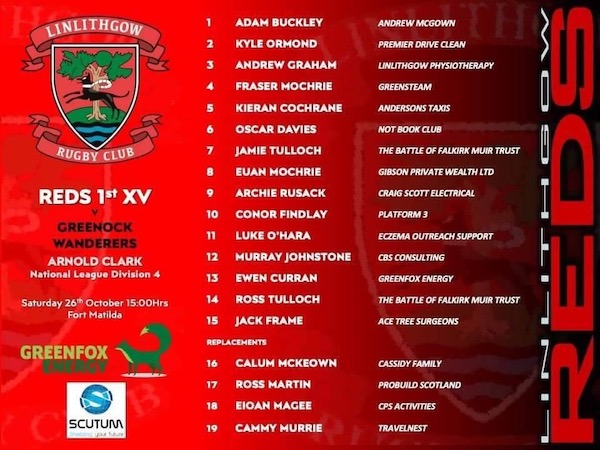 Fort Matilda was the picturesque venue for this Arnold Clark National League Division 4 fixture with Greenock Wanderers hosting the Reds in what turned out to be a tightly contested and low scoring affair. Fraser Mochrie was restored to the starting XV and Alfie Muir was on the replacements bench and hoping to make his 1st XV debut after receiving approval from Scottish Rugby to play senior rugby despite being under 18. Another significant milestone was achieved by Jamie Tulloch who was making a well deserved 50th appearance for the team.