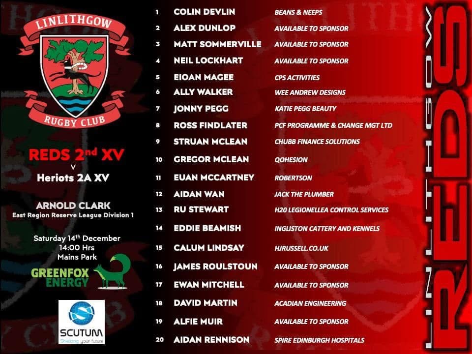 The league leaders Heriots travelled to Mains Park in fine fettle having scored over 500 points in 10 matches! It was the only senior match as the Reds 1st XV had no game. Mind you most of them were there in their festive dress adding words of advice from the touchline, which was appreciated by both Heriots and Linlithgow!!!! The 2s had a strong squad with the inclusion of a couple of fringe first team players in the backs and one in the forwards.