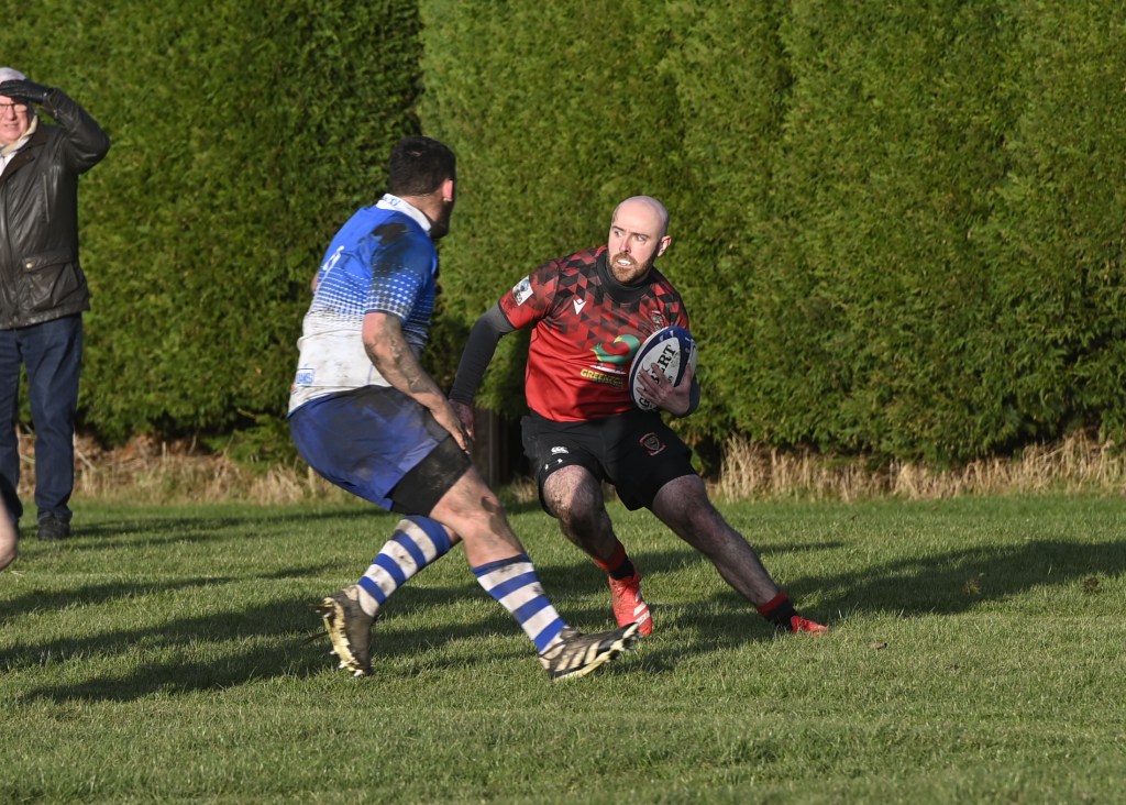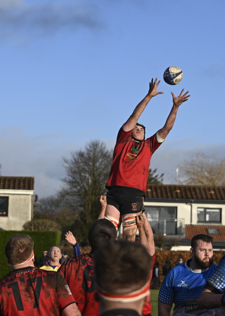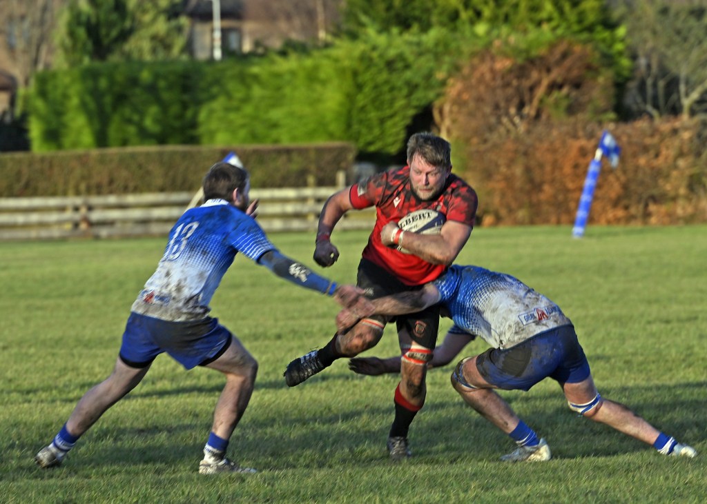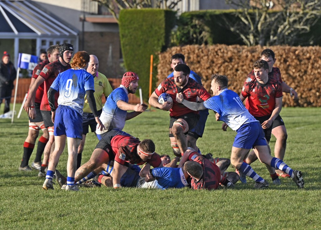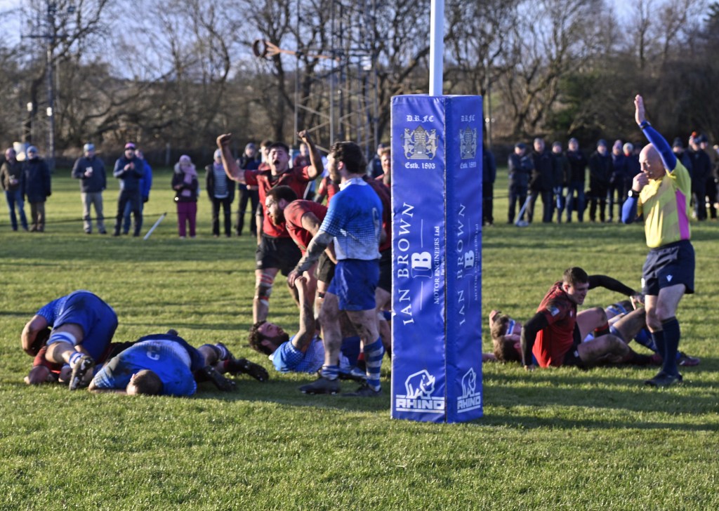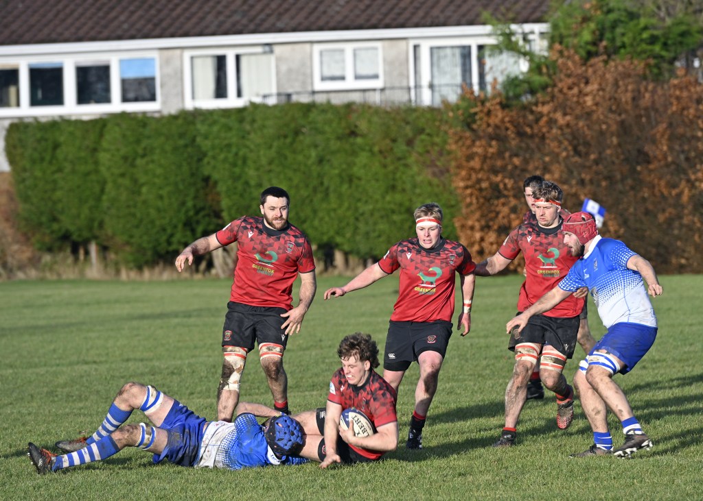The Reds started the 2nd half with a spell of good pressure and looked dangerous in attack, but aggressive and effective defence from the home side kept them out. The home side then scored with their first foray of the half into the visitors’ territory when a strong line-out catch and drive took play to the 22-metre line where the home scrum half, using a teammate as a blocker, scuttled through for a try which was converted to make the score 24-12. This set a stern test for the Reds but one which they passed with flying colours. Some fine rampaging runs by Euan Mochrie, Jamie Tulloch, Ross Martin and the evergreen Stuart Cunningham set the tone for the comeback and sustained pressure was applied to the Dunfermline defence. After a long period in the home 22 metre area, a quick tap penalty was taken by Andrew Graham and after several attempts to muscle the ball over the line it was spread wide through the hands of Conor Findlay and Cammy Murrie who sent Luke O’Hara over in the corner with several tacklers failing to bring him down.