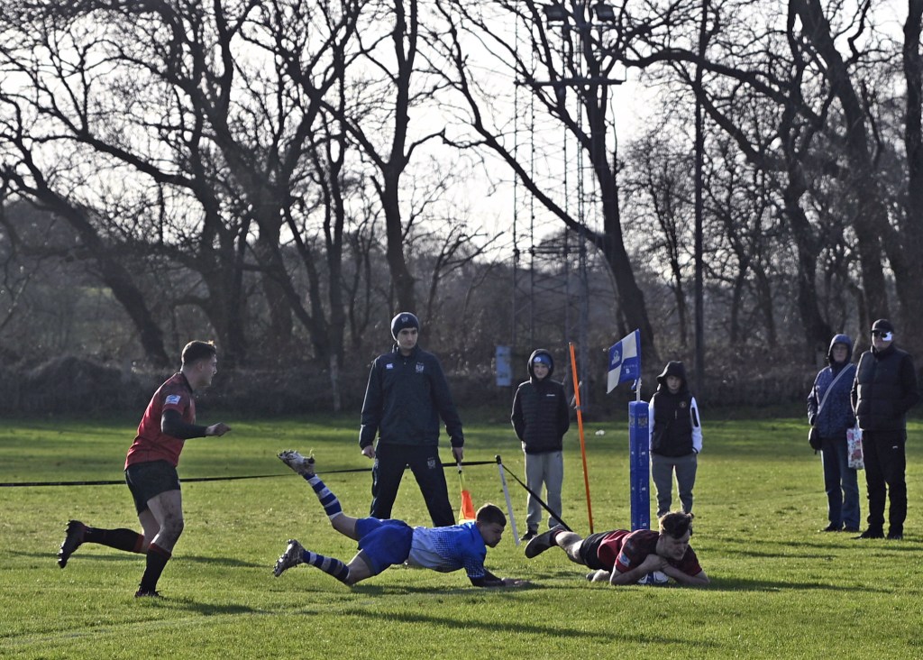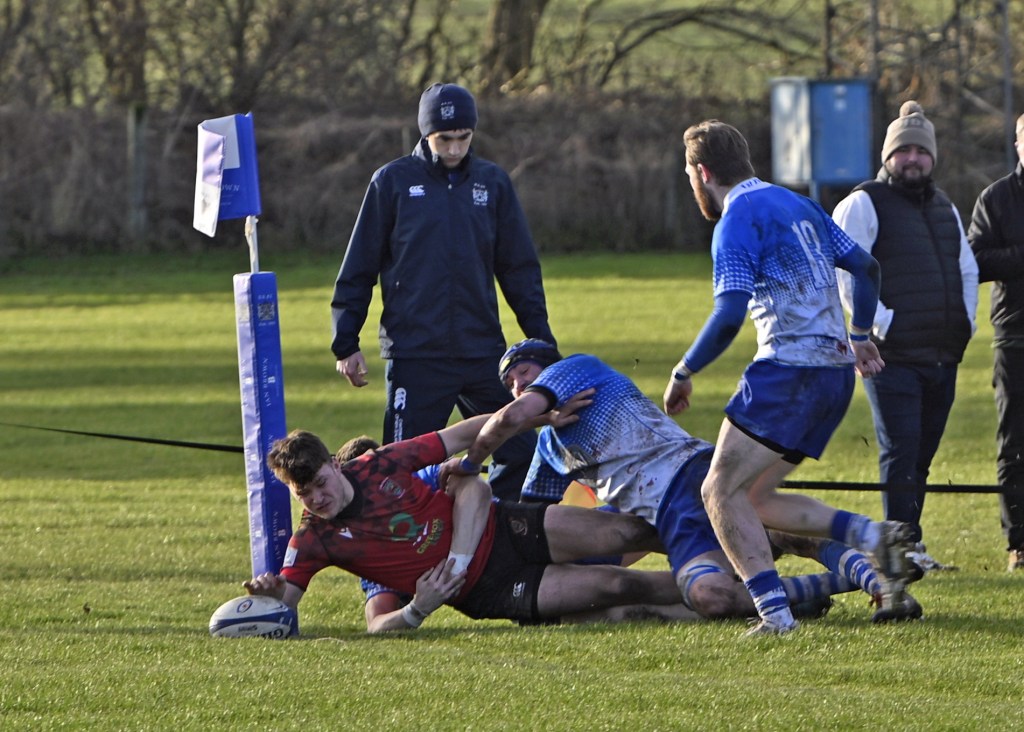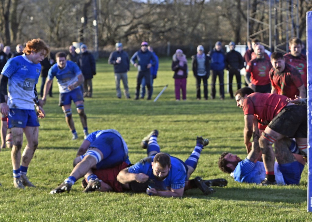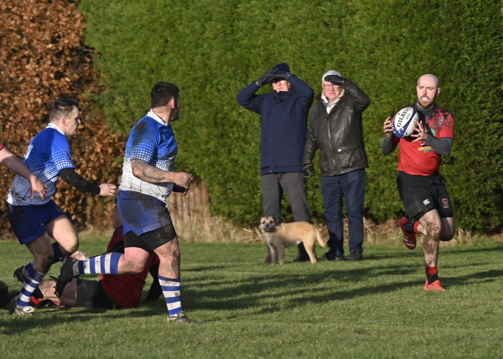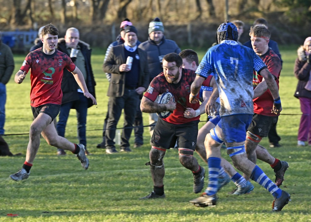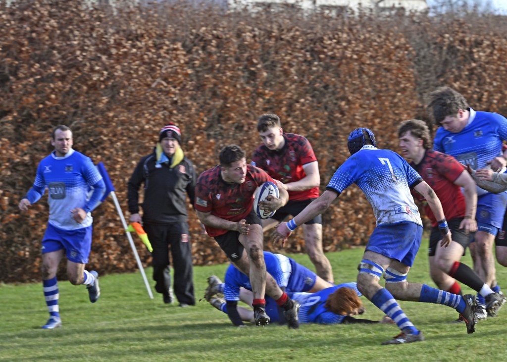 The Reds started the 2nd half with a spell of good pressure and looked dangerous in attack, but aggressive and effective defence from the home side kept them out. The home side then scored with their first foray of the half into the visitors’ territory when a strong line-out catch and drive took play to the 22-metre line where the home scrum half, using a teammate as a blocker, scuttled through for a try which was converted to make the score 24-12. This set a stern test for the Reds but one which they passed with flying colours. Some fine rampaging runs by Euan Mochrie, Jamie Tulloch, Ross Martin and the evergreen Stuart Cunningham set the tone for the comeback and sustained pressure was applied to the Dunfermline defence. After a long period in the home 22 metre area, a quick tap penalty was taken by Andrew Graham and after several attempts to muscle the ball over the line it was spread wide through the hands of Conor Findlay and Cammy Murrie who sent Luke O’Hara over in the corner with several tacklers failing to bring him down.