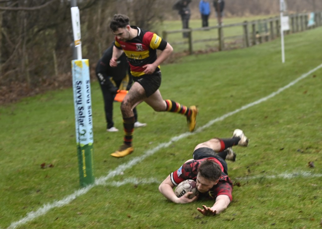 The early play was in the visitors’ half and Jack Frame opened the scoring with a penalty kick in the first few minutes. This was soon followed by a fine try out wide from the in-form Ru Stewart after good work down the left wing by Ross Tulloch, and a strong driving thrust by Kieran Cochrane. This allowed Archie Rusack to release the backs and Jack Frame gave the scoring pass to Ru Stewart who sprinted in for the try.