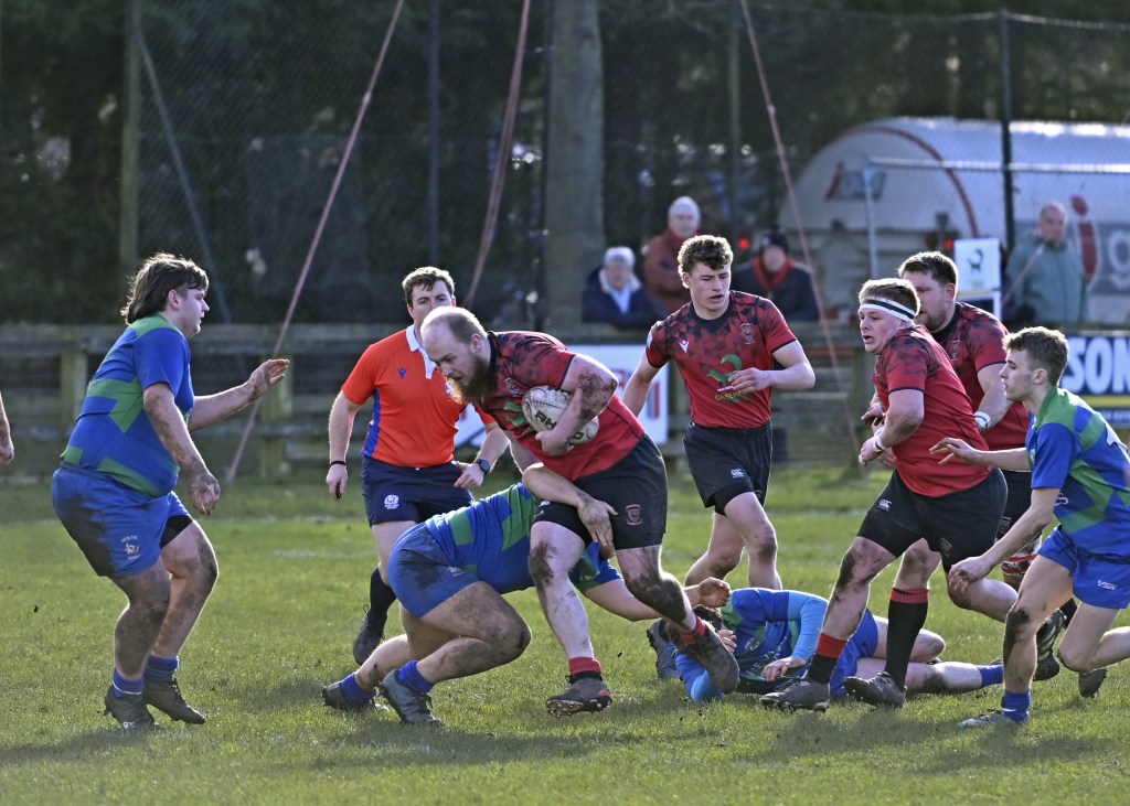 The next try was a real team effort that started deep inside the Reds’ half. Jamie Tulloch secured the ball from a Hamilton line-out overthrow, and he passed to the midfield backs. Ru Stewart made good ground before being stopped but the charging Ross Martin timed his run into the line perfectly and almost reached the try line when hauled down. After some frenetic attempts to cross the line, some good tidying up work by Cammy Murrie and Murray Johnstone allowed the Reds to create space on the left wing with Ru Stewart sending the supporting Archie Rusack in for the try that was converted by Jack Frame.