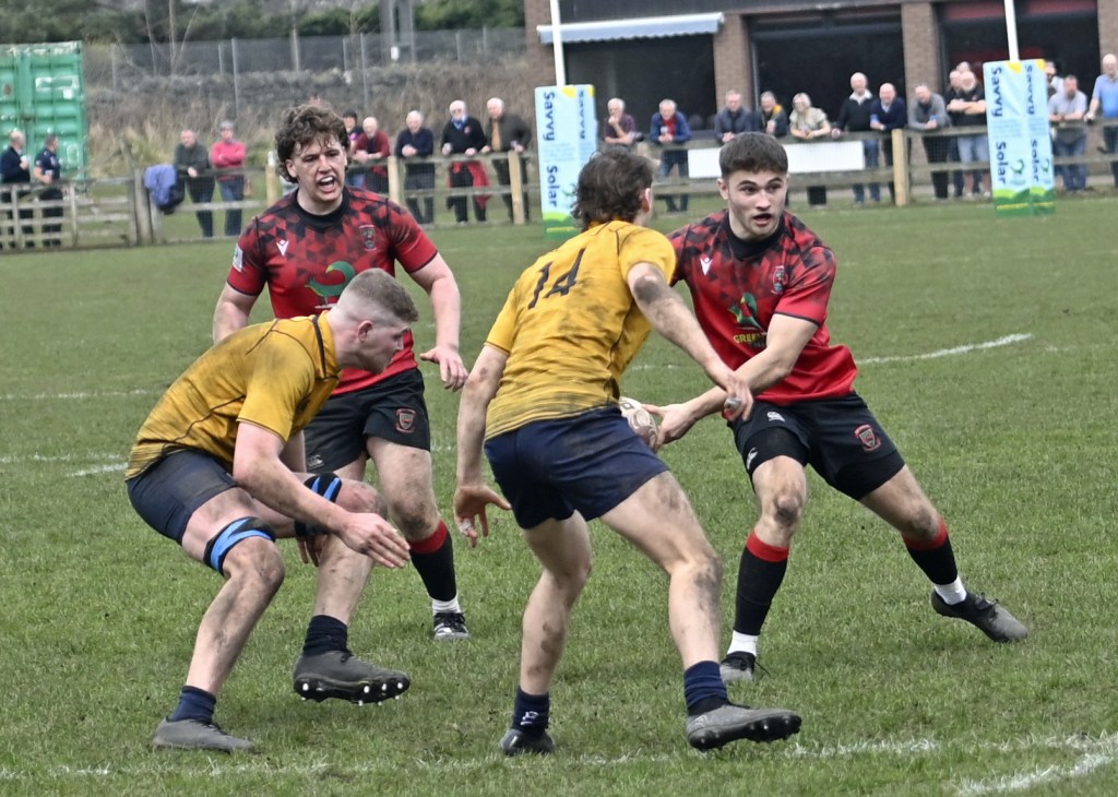 All the bench contributed to the game – here Johnny Pegg, Calum Lindsay and Ewan Curran (all subs) feature in second half action
