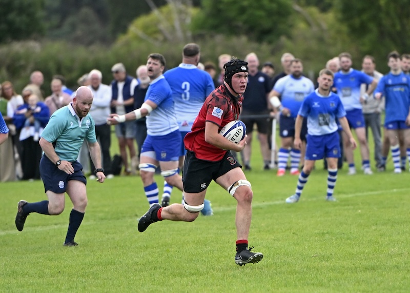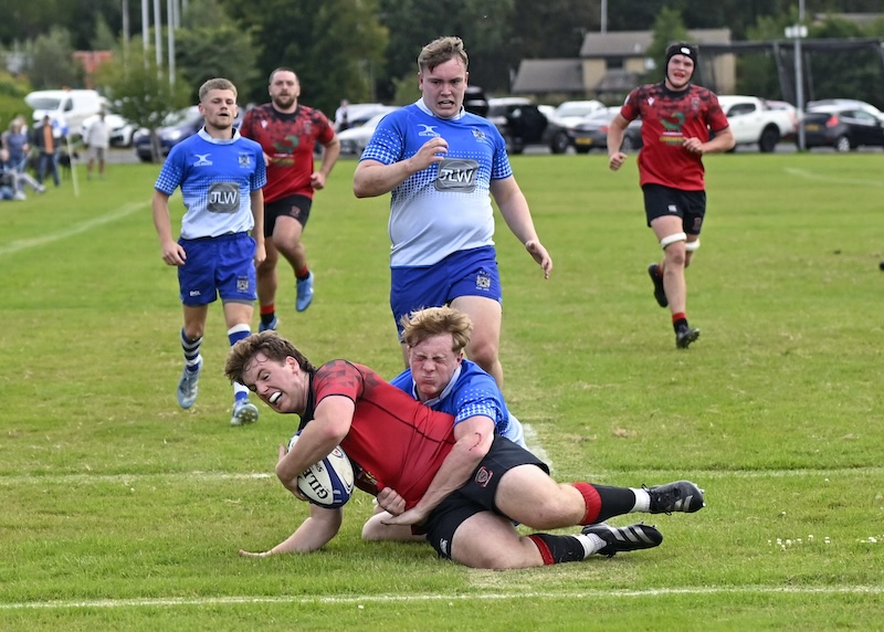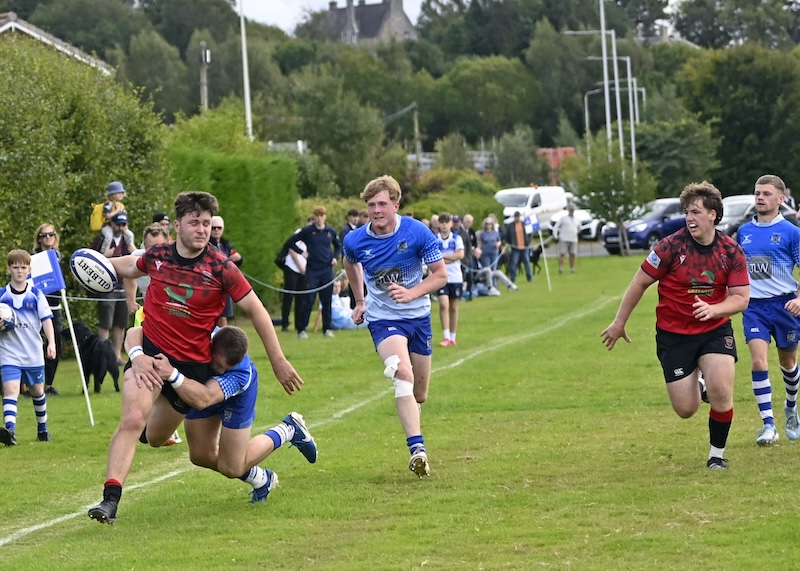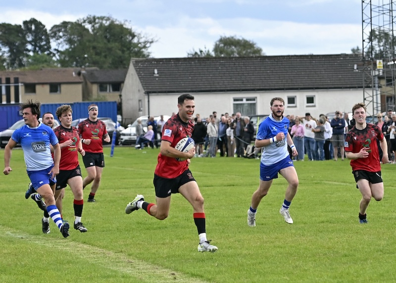 Luke O’Hara (top) charges up the wing and offloads to Murray Johnstone for the try