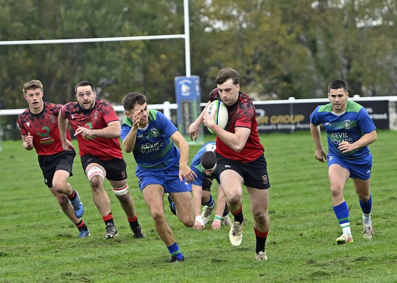 The Reds were keen to initiate attacks from almost anywhere on the pitch as they gradually softened up the home side and it was no surprise when the visitors scored a 3rd try. The move again worked smoothly after great line-out ball being won and a straightforward passing move culminating in a beautiful offload from Ruaridh Stewart to the marauding right winger Luke O’Hara who galloped over the line for a try that was converted by Jack Frame.