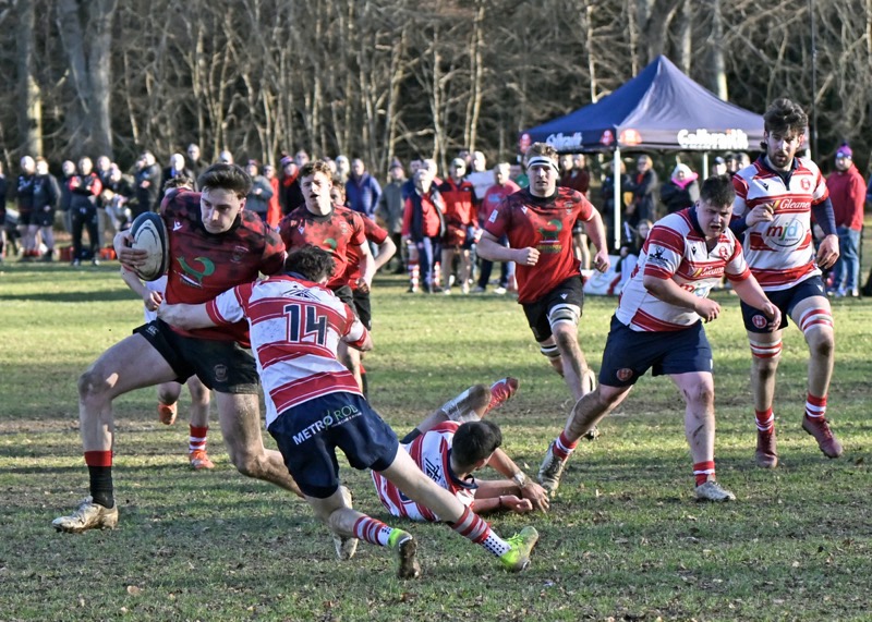As half time approached, the Reds, despite having a healthy lead and a Try Bonus Point, kept the pressure on and were rewarded with a 5th try of the half. Spaces were now beginning to open in midfield as the home side scrambled to cover the wide areas, and Kyle Ormond supplied the pass to allow Jack Frame to identify a space and the number 10 scooted through on a 30 metre diagonal run to score wide out on the right wing.