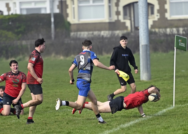 Ardrossan did add another penalty soon after, but the Reds stormed back downfield and were rewarded with a typically slick try. Hooker Kyle Ormond found Oscar Davies in the line-out and Archie Rusack set the backs running hard at the Ardrossan midfield defence and after some neat passing, Jack Frame sent Ewan Curran over the line to complete a fine scoring move.